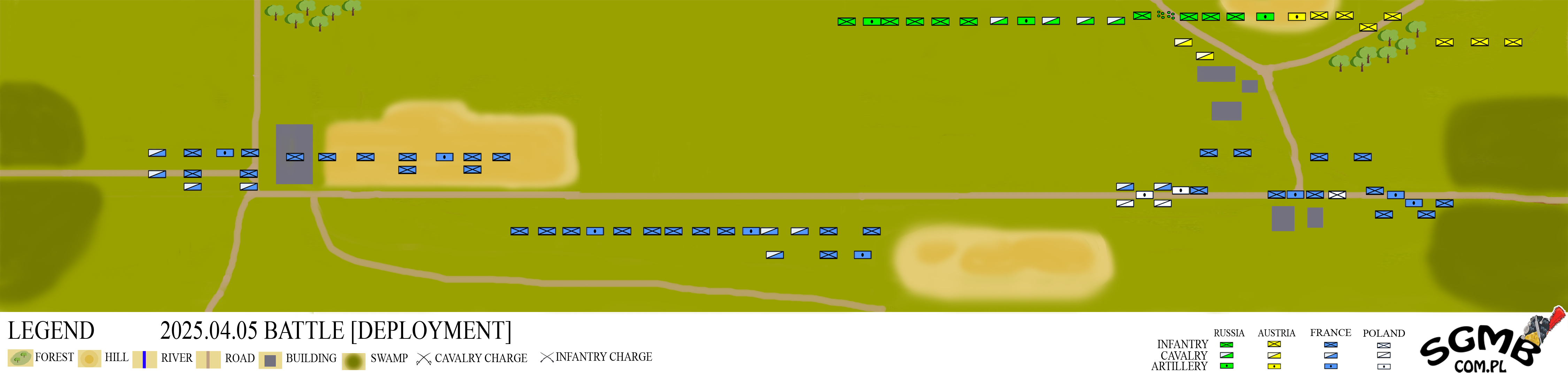 1 Division - Generall-Feldmarschall Michaił Kutuzow     Guard Brigade       Guard battalion       Guard battalion       Guard battalion       Guard battalion       Jager Guard battalion       Horse Artillery battery     I Light Brigade       Dragons regiment       Dragons regiment       Uhlan regiment       Irregural Cossacks       Horse Artillery battery     I Infantry Brigade       Infantry battalion       Infantry battalion       Infantry battalion       Infantry battalion       Volunteer Jager battalion       Artillery batery   2 Division     II Light Brigade       Dragons regiment       Dragons regiment       Hussar regiment       Irregular Cossacks       Horse Artillery battery     II Infantry Brigade       Infantry battalion       Infantry battalion       Infantry battalion       Jager battalion       Opolochenye       Artillery battery     IV Jager Brigade       Jager battalion       Jager battalion       Jager battalion       Jager battalion   3 Division     Cossacks Brigade       Cossacks regiment       Cossacks regiment       Cossacks regiment       Irregular Cossacks       Horse Artillery battery     III Infantry Brigade       Jager batalion       Infantry battalion       Infantry battalion       Infantry battalion       Infantry battalion       Artillery battery     Cuirassier Brigade       Cuirassier regiment       Cuirassier regiment       Irregular Cossacks   4 Division (Austrian)     I Infantry Brigade       Infantry battalion (German)       Infantry battalion (German)       Artillery battery     II Infantry Brigade       Infantry battalion (German)       Infantry battalion (German)     III Infantry Brigade       Infantry battalion (Hungarian)       Infantry battalion (Hungarian)       Grenadier battalion (German)     I Cavalry Brigade       Cuirassier regiment       Cuirassier regiment Black - Michał units Blue - Wojtek units lead by Grzegorz |