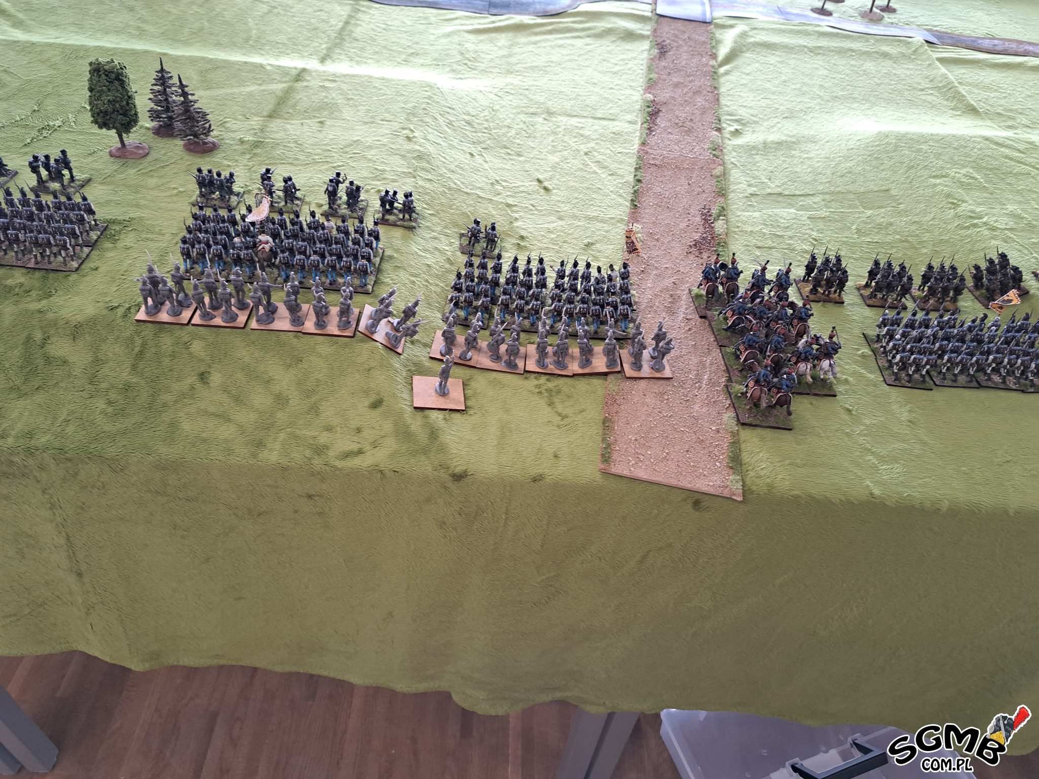 Tura 2. Francuskie centrum i lewe skrzydło powoli posunęło się naprzód. Jednak bez lekkiej jazdy. Jak się później okaże, nie miała ona dzisiaj ochoty do walki. Turn 2. The French center and left wing slowly advanced. However, without the light cavalry. As it would later turn out, they were in no mood for combat today.