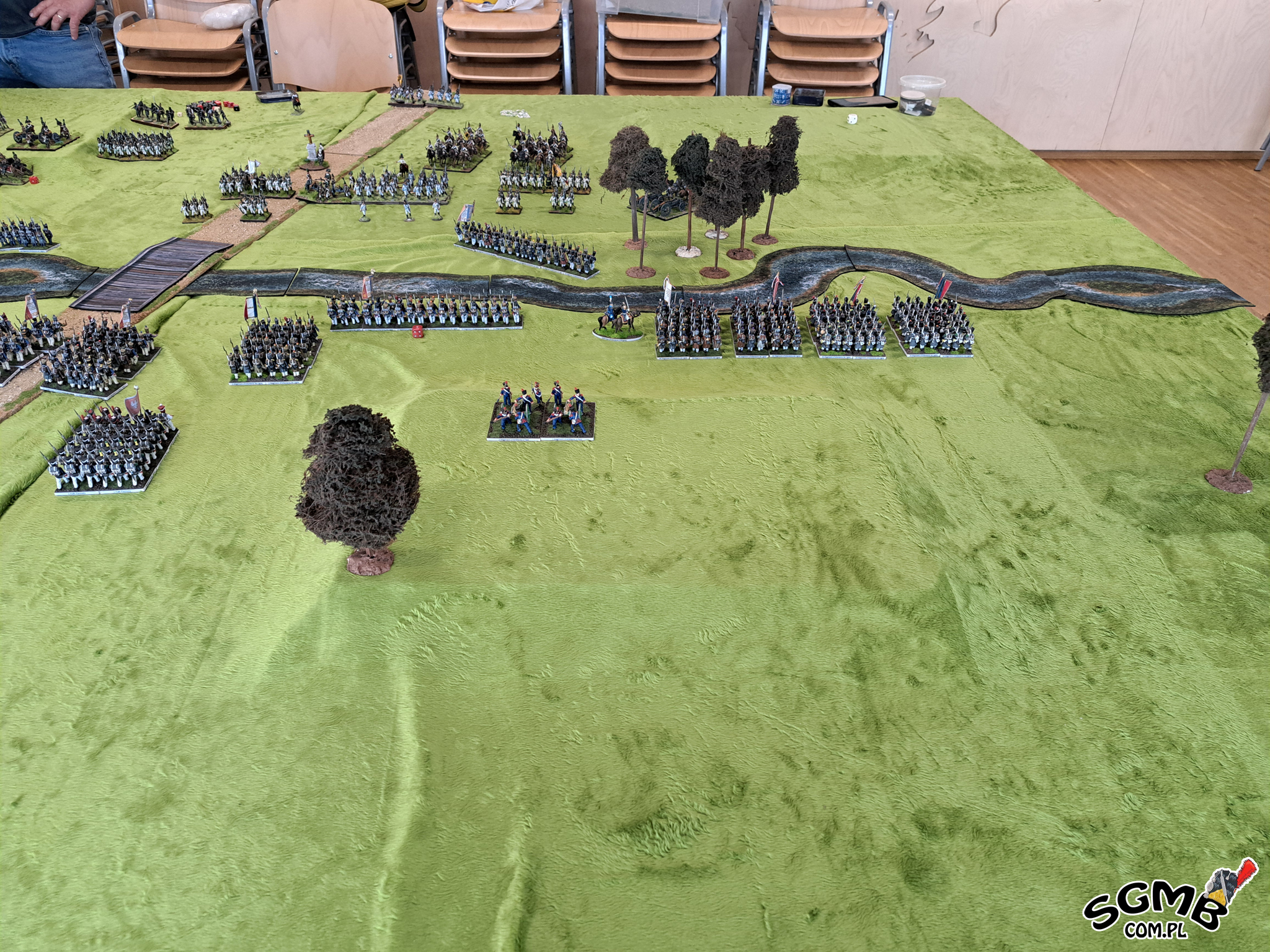 In the fourth round, on the French right flank, battalions approached the river, and individual units began crossing it. The light infantry in the center hid in the forest and took up positions on either side.