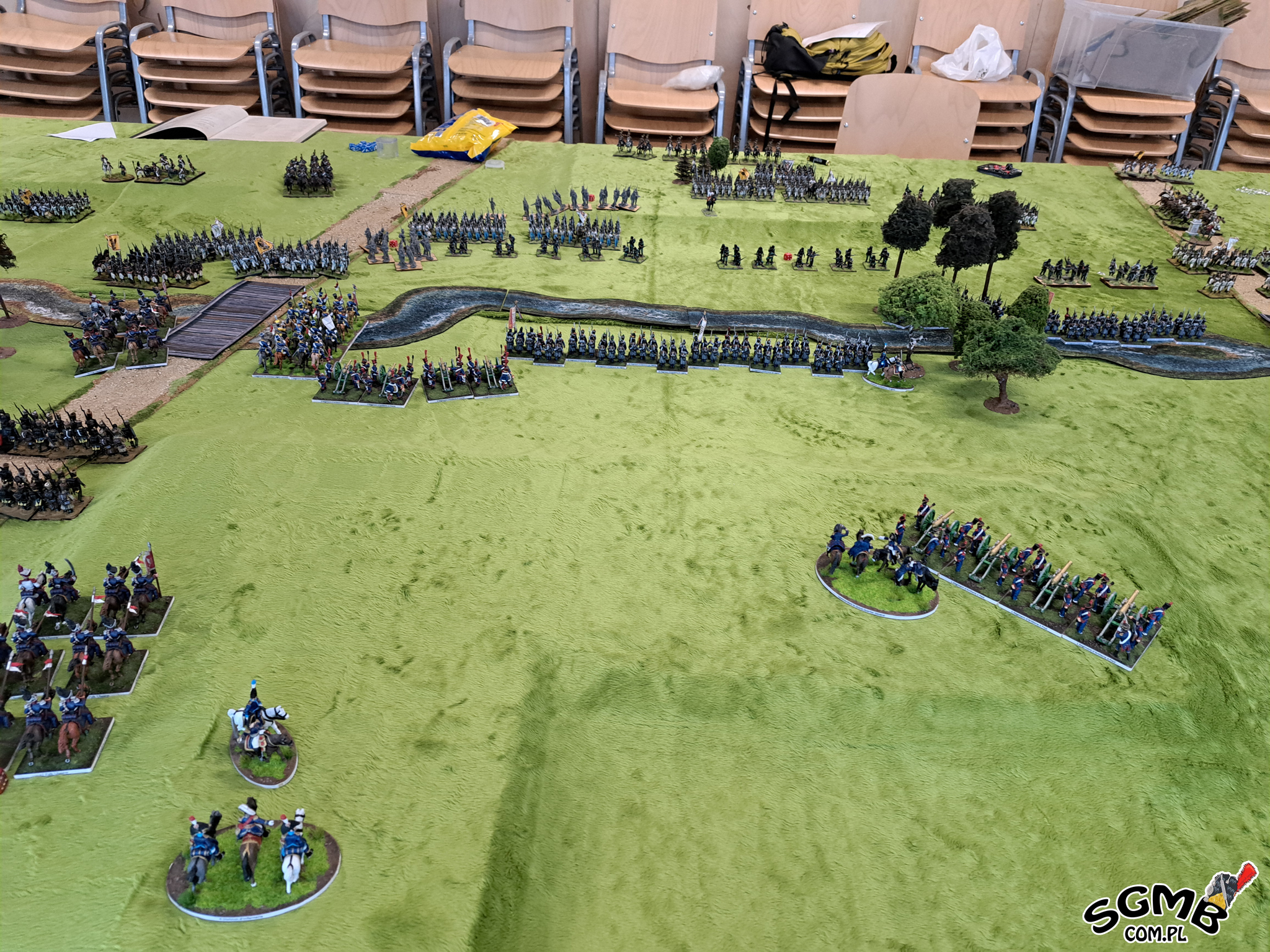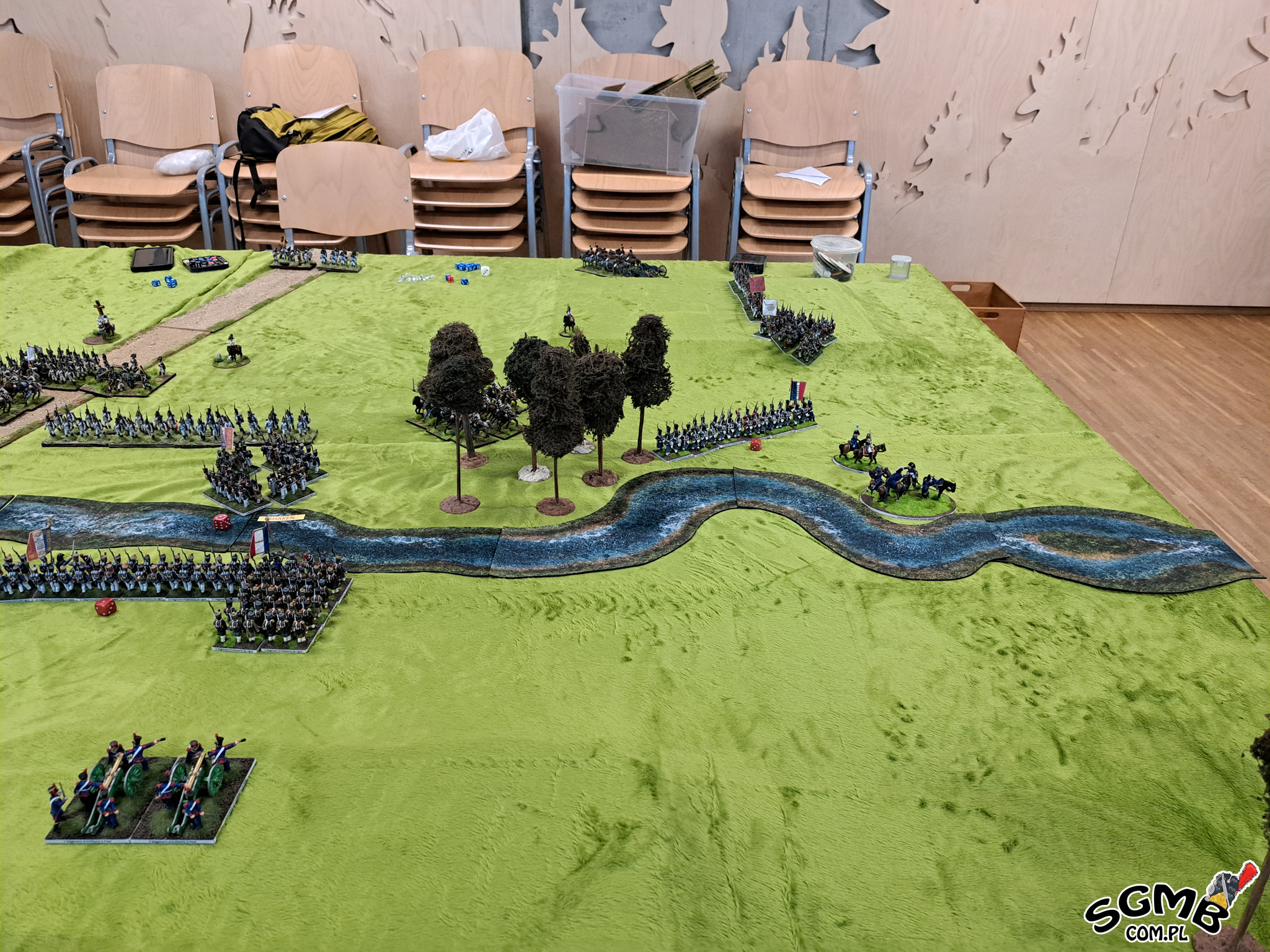 Tura 4. Pojedyncze Francuskie bataliony przekraczają rzekę. Lekka piechota wraz z artylerią konną łamią Brygadę Wirtemberską. Turn 4. Single French battalions cross the river. Light infantry and horse artillery break the Württemberg Brigade.