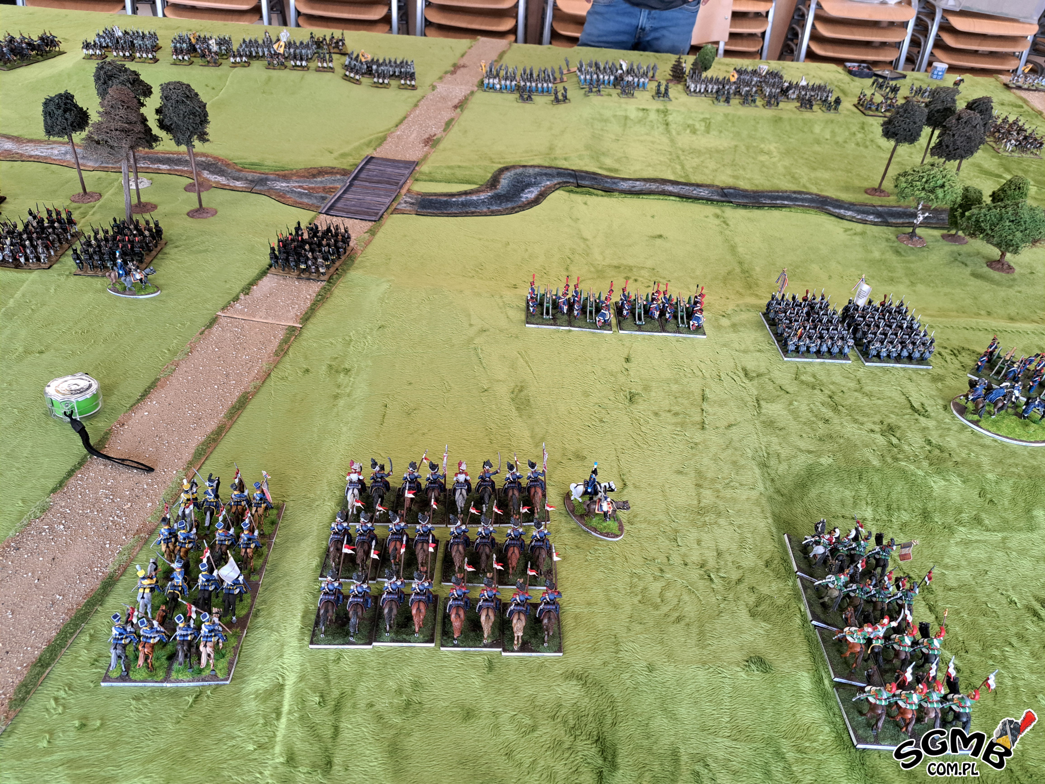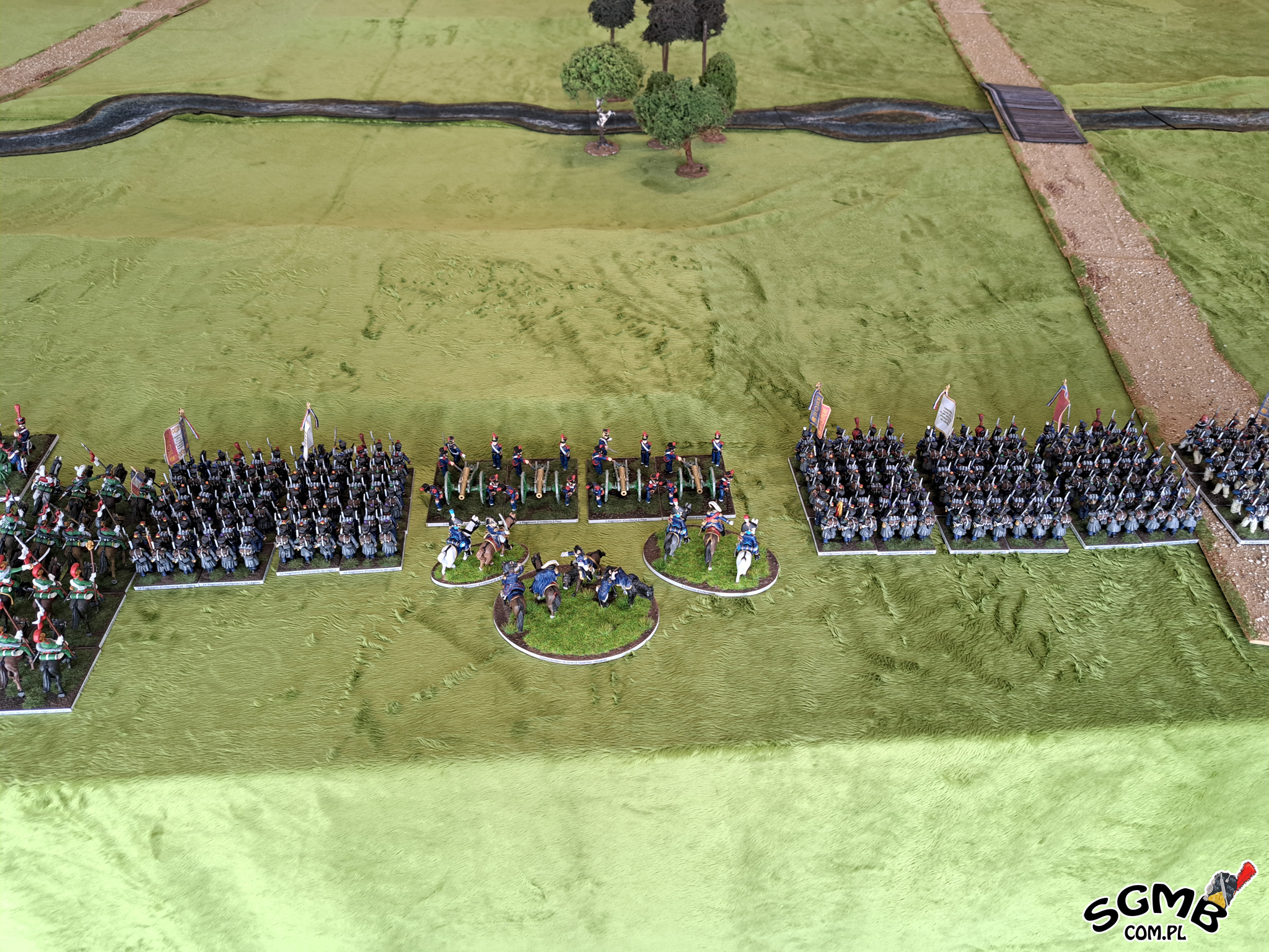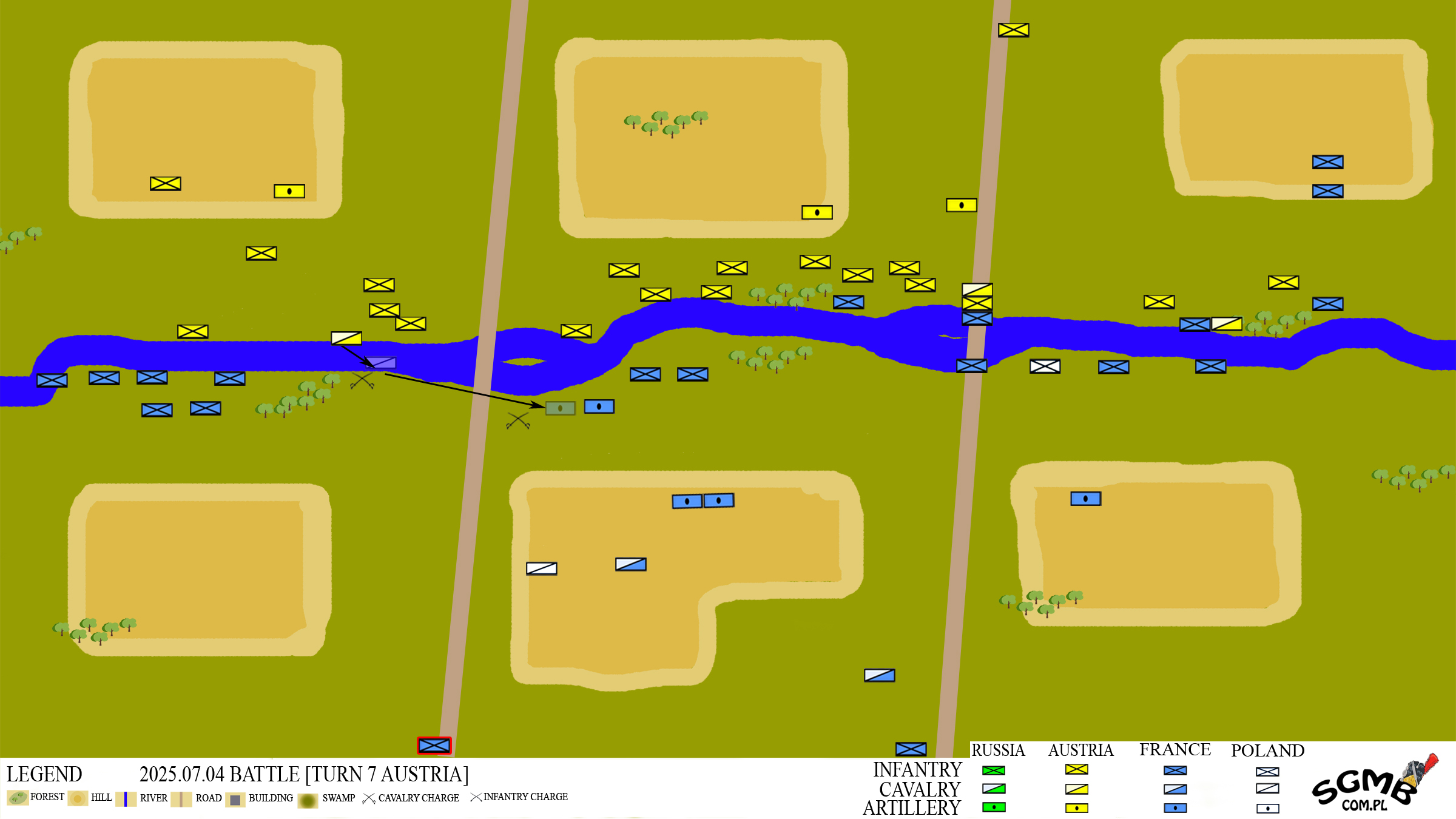 Tura 7. Szarża Huzarów Austriackich spędza z pola Ułanów Księstwa Warszawskiego i wpada w artylerię konną. Powstaje pusta przestrzeń między dwiema dywizjami Francuskimi. Turn 7. The Austrian Hussars' charge drives the Duchy of Warsaw Uhlans from the field and engages the horse artillery. A gap is created between the two French divisions.