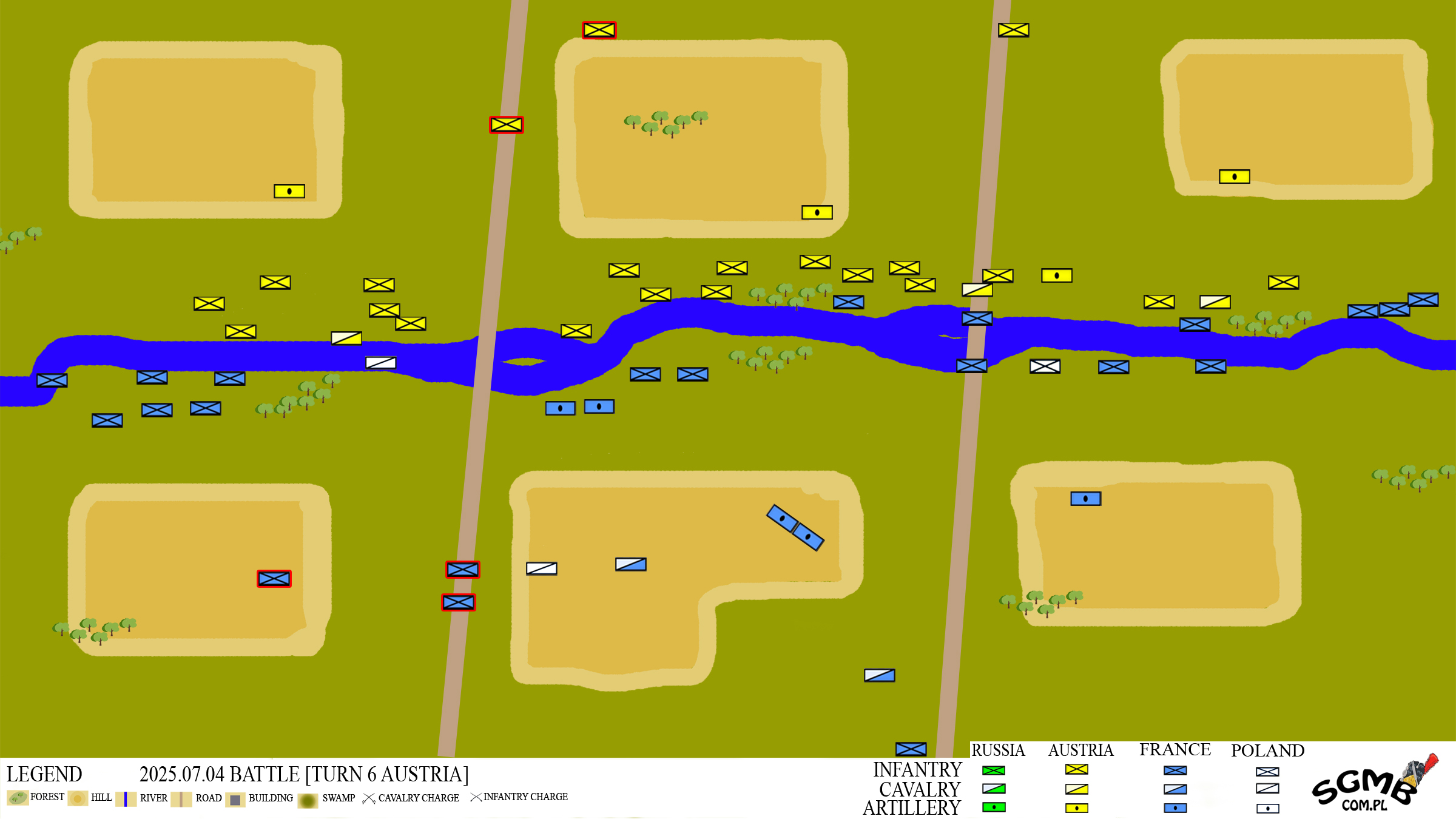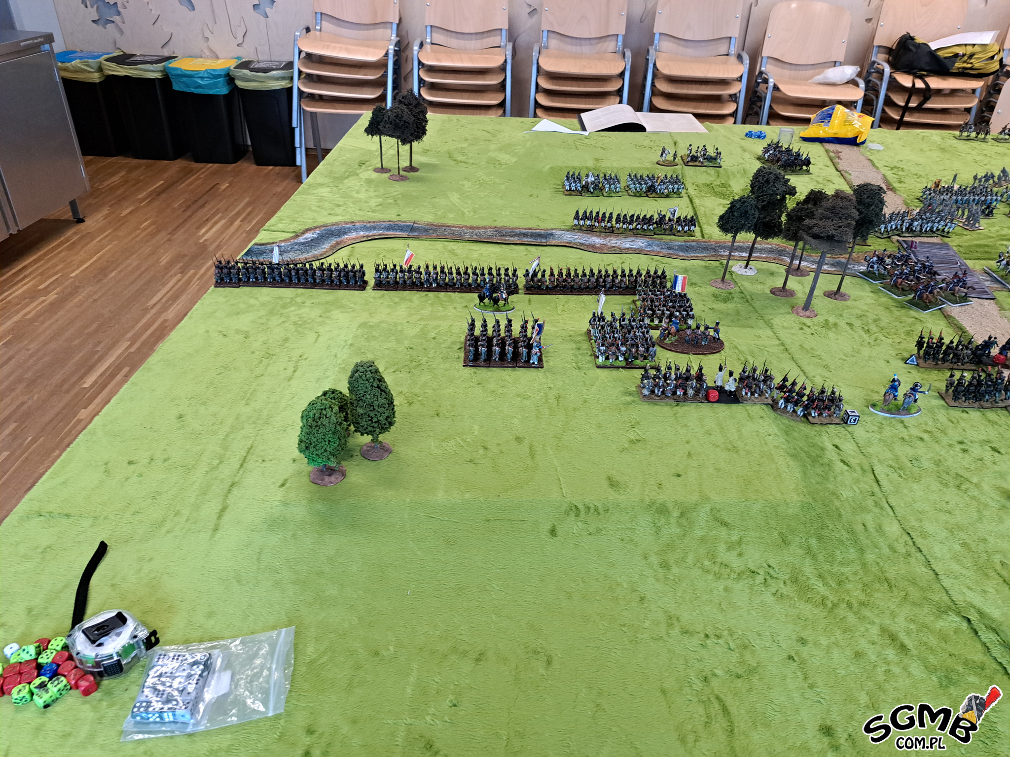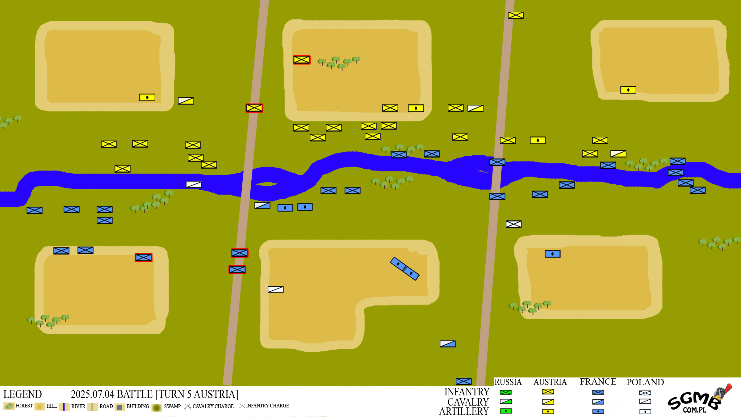 Tura 7. Szarża Huzarów Austriackich spędza z pola Ułanów Księstwa Warszawskiego i wpada w artylerię konną. Powstaje pusta przestrzeń między dwiema dywizjami Francuskimi. Turn 7. The Austrian Hussars' charge drives the Duchy of Warsaw Uhlans from the field and engages the horse artillery. A gap is created between the two French divisions.