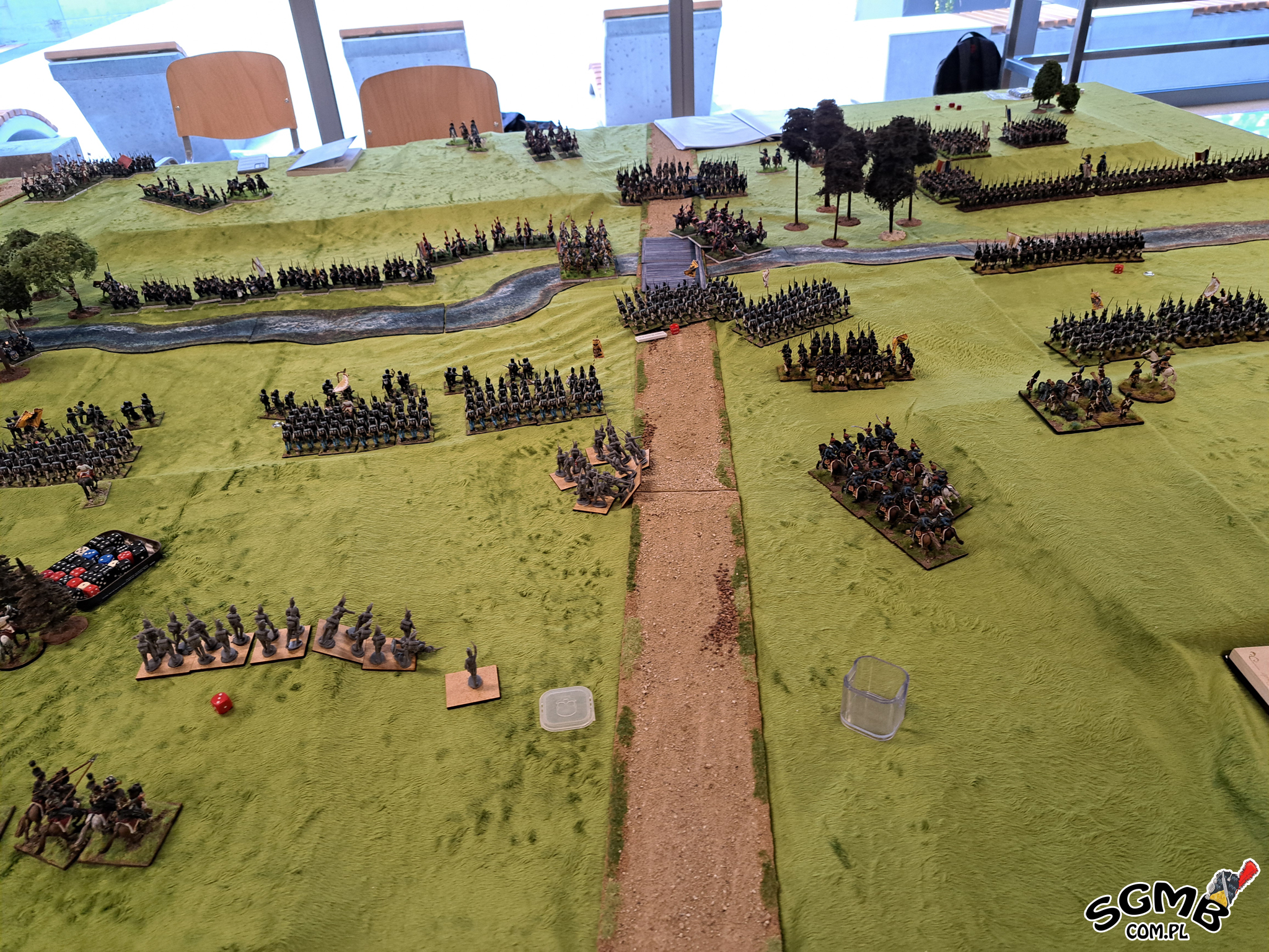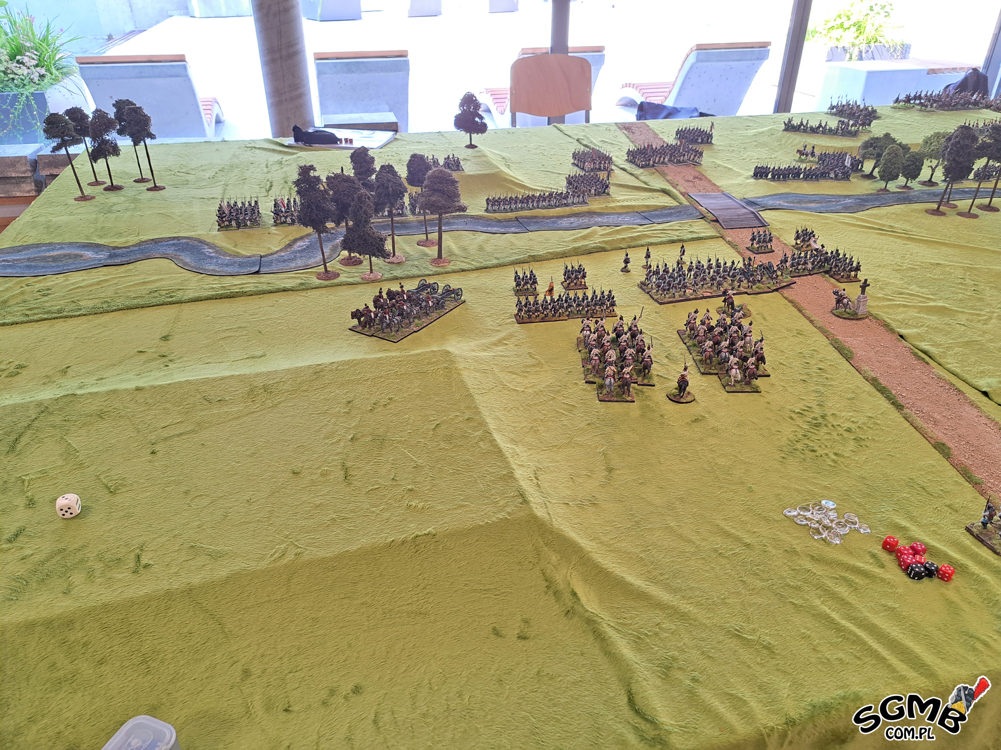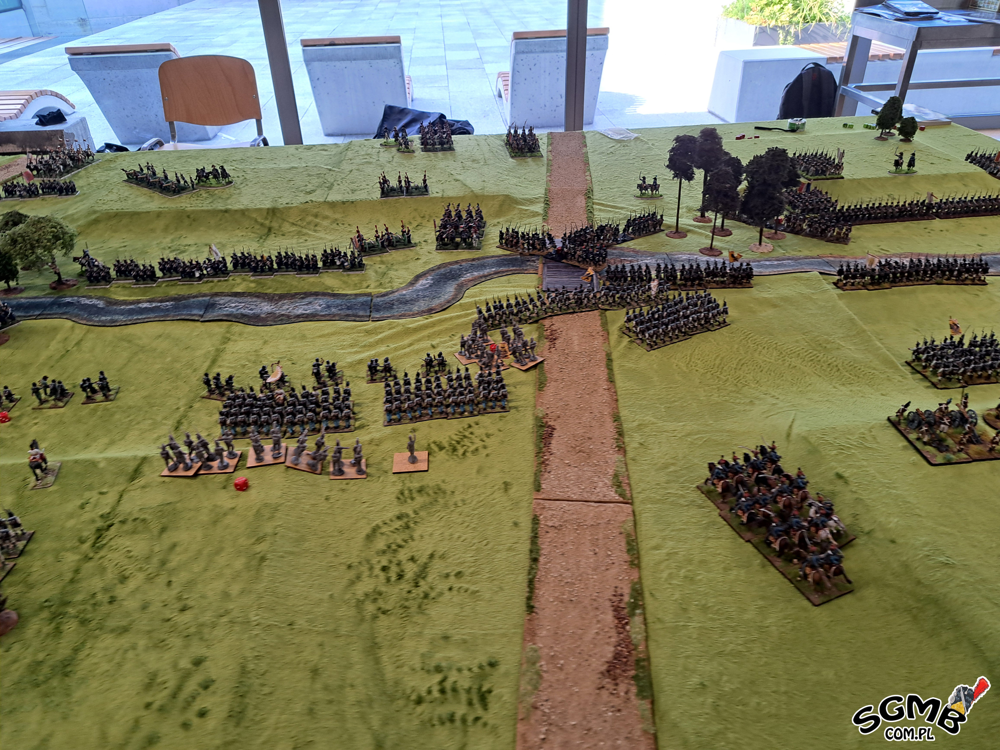Tura 7. Centrum Francuzów, podobnie jak Austriackie rozwinięte w linie. Z tyłu batalion, który pomylił rozkazy i Kawaleria, której wkład w bitwie może zostać pominięty. Turn 7. The French center, like the Austrians, was deployed in lines. In the rear, a battalion that had confused its orders and cavalry whose contribution to the battle could be overlooked.