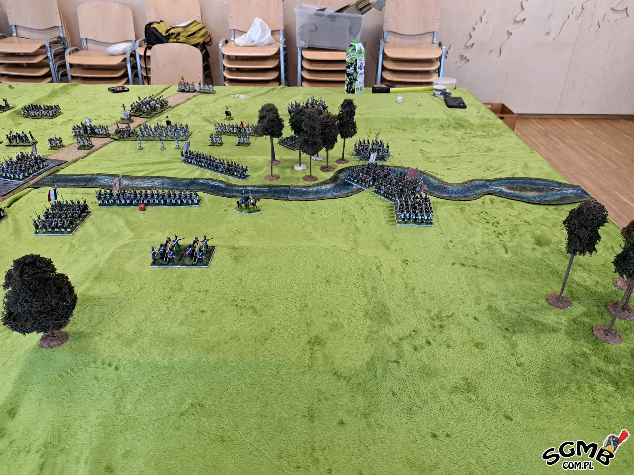 Tura 4. Pojedyncze Francuskie bataliony przekraczają rzekę. Lekka piechota wraz z artylerią konną łamią Brygadę Wirtemberską. Turn 4. Single French battalions cross the river. Light infantry and horse artillery break the Württemberg Brigade.
