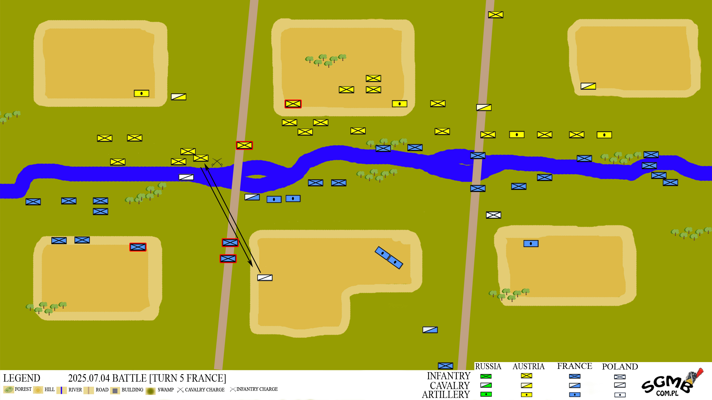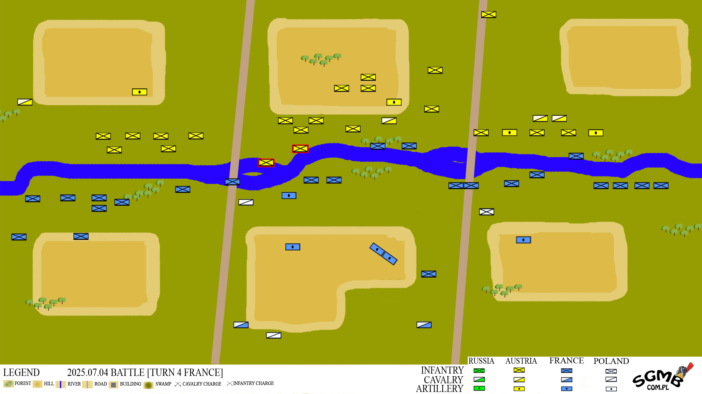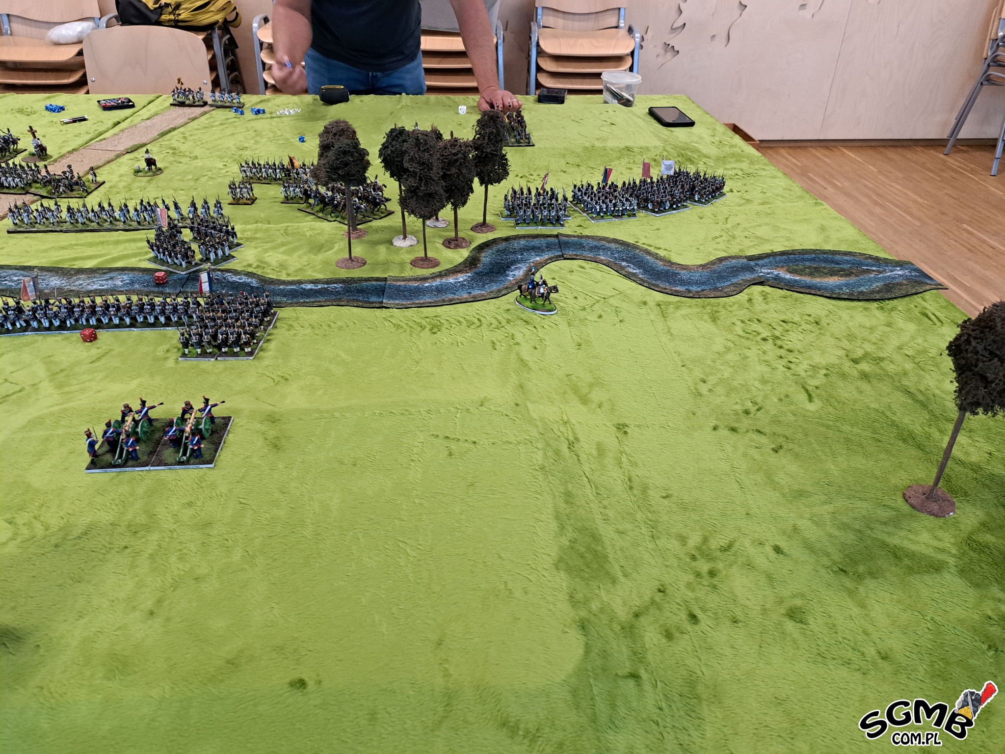 In the fourth round, on the French right flank, battalions approached the river, and individual units began crossing it. The light infantry in the center hid in the forest and took up positions on either side.