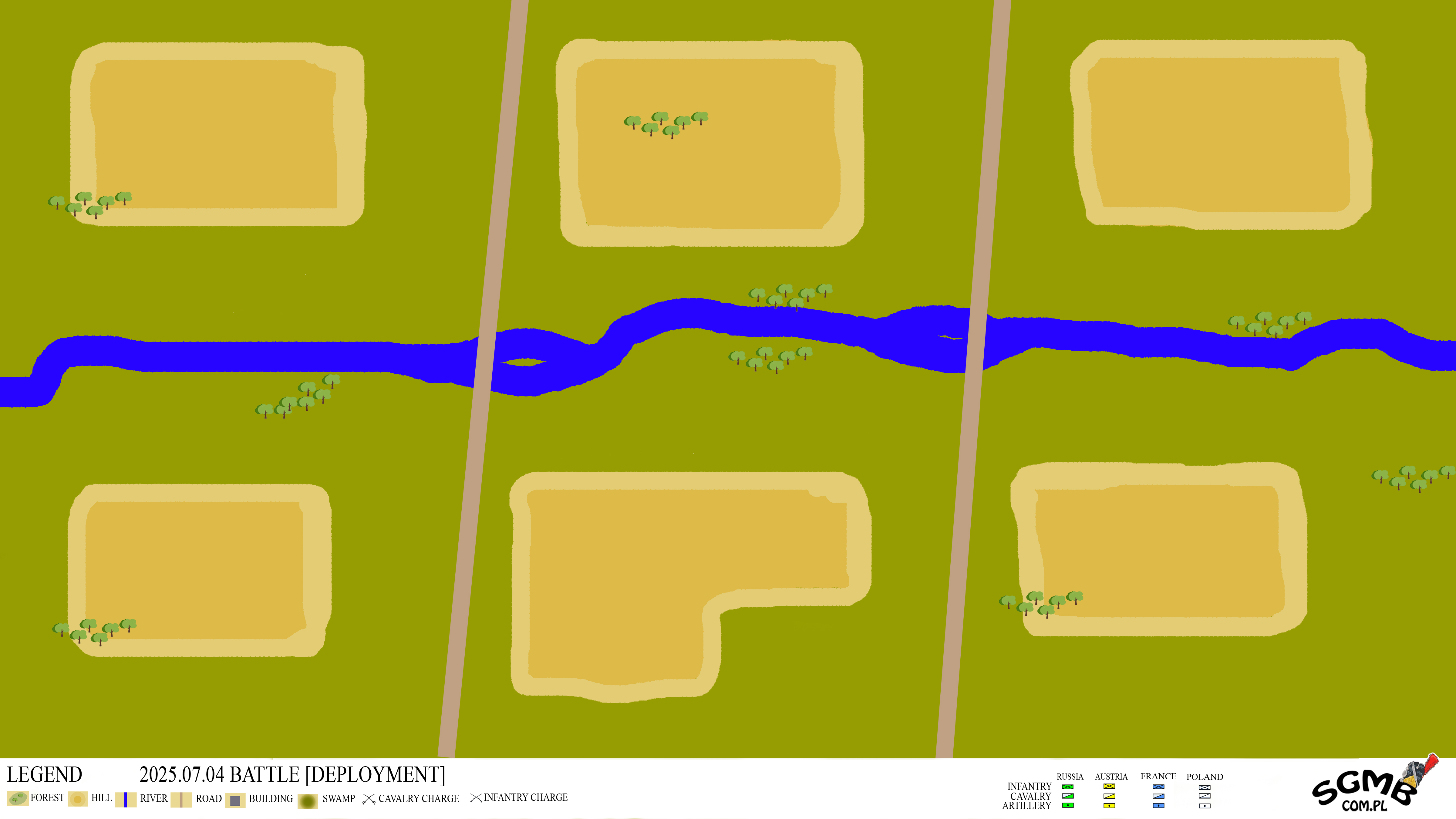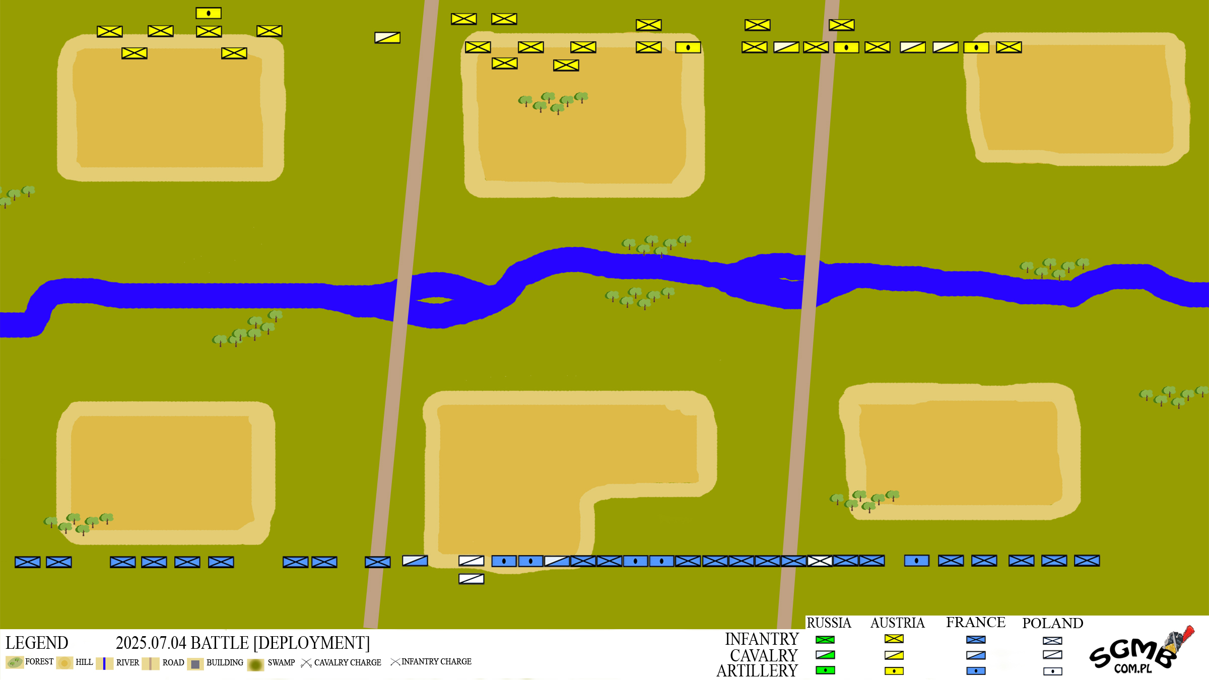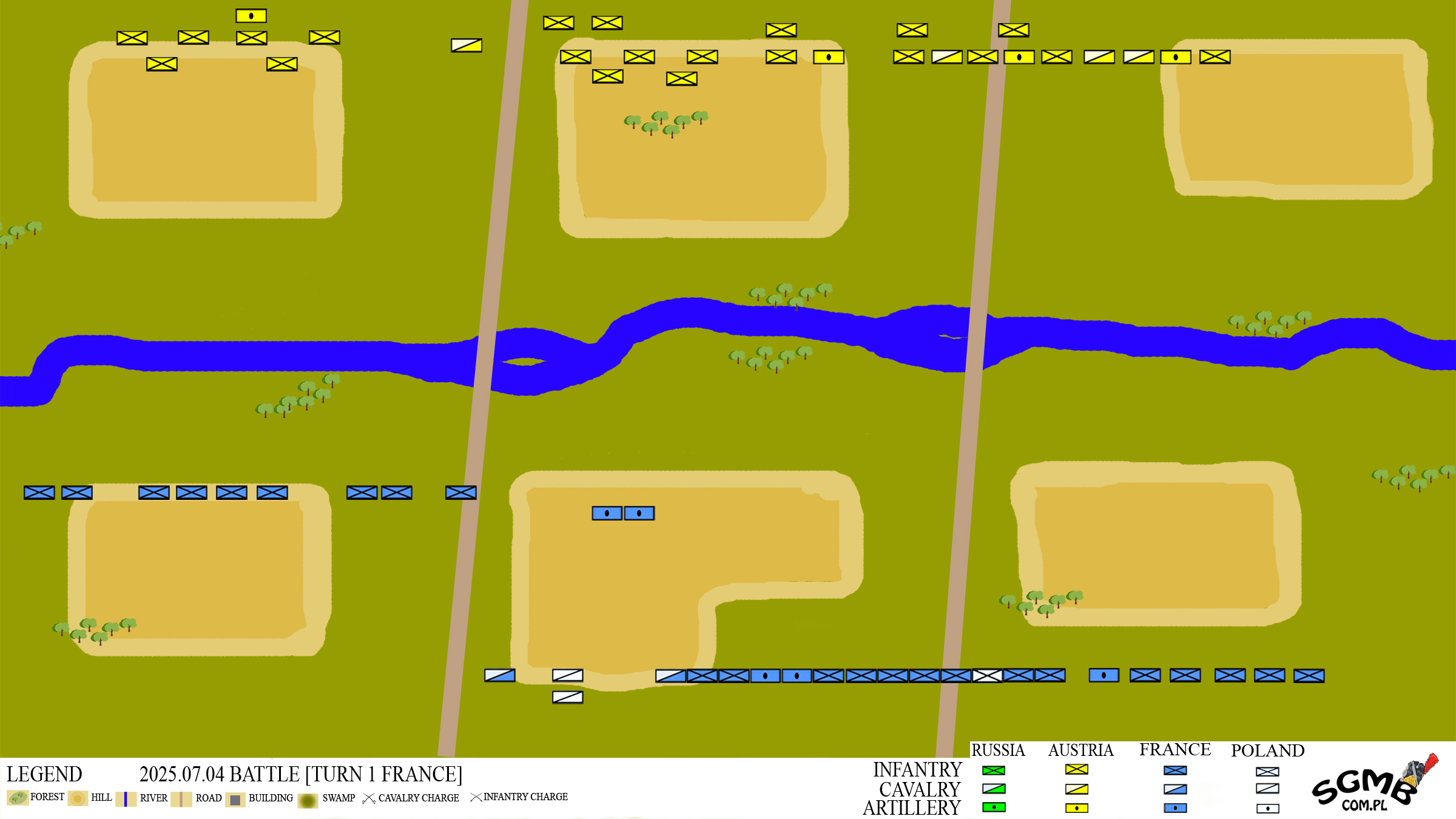 In the fourth round, on the French right flank, battalions approached the river, and individual units began crossing it. The light infantry in the center hid in the forest and took up positions on either side.