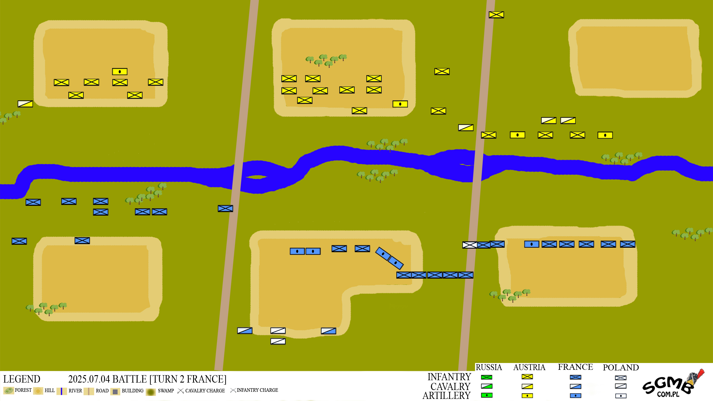 Tura 2. Francuskie centrum i lewe skrzydło powoli posunęło się naprzód. Jednak bez lekkiej jazdy. Jak się później okaże, nie miała ona dzisiaj ochoty do walki. Turn 2. The French center and left wing slowly advanced. However, without the light cavalry. As it would later turn out, they were in no mood for combat today.